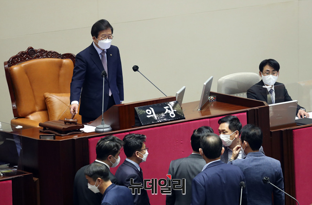 박병석 국회의장이 27일 오후 국회에서 열린 국회 본회의에서 여야 의원들에게 자리로 돌아갈 것을 말하고 있다. (사진=공동취재단)