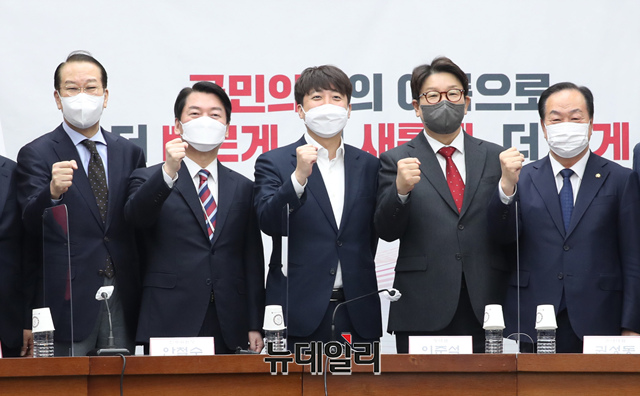 안철수 대통령직인수위원회 위원장과 이준석 국민의힘 대표, 권성동 원내대표 등 참석자들이 28일 국회에서 열린 국민의힘·대통령직인수위원회 첫 당정협의에서 파이팅을 외치고 있다.