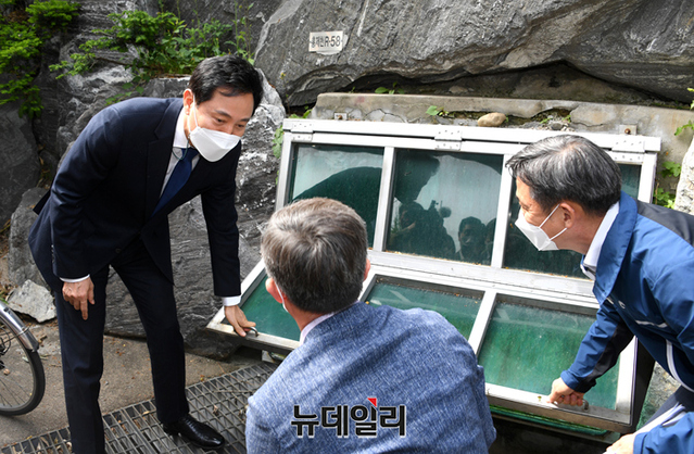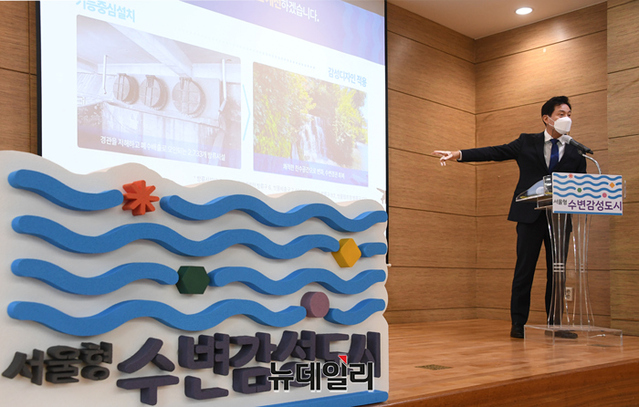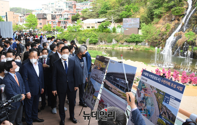 오세훈 서울시장이 28일 오후 서울 서대문구 홍제천 인근에서 '서울형 수변감성도시 현장 기자 설명회'를 마치고 홍제천 인공폭포 일대를 둘러보고 있다. 서울시는 '서울형 수변감성도시' 사업을 통해 서울 전역에 흐르는 332㎞의 실개천과 소하천 등 수변을 중심으로 공간구조를 재편할 예정이다. (사진=서울시)