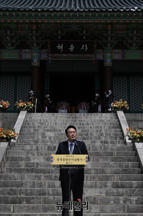 윤석열 대통령 당선인이 28일 오전 충남 아산 현충사에서 진행된 충무공 이순신 장군 탄신 477주년 기념 다례제에서 발언을 하고 있다. (사진=인수위)