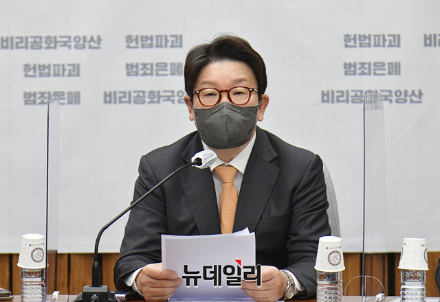 권성동 국민의힘 원내대표가 29일 오전 국회에서 열린 원내대책회의에서 모두발언을 하고 있다.
