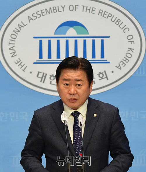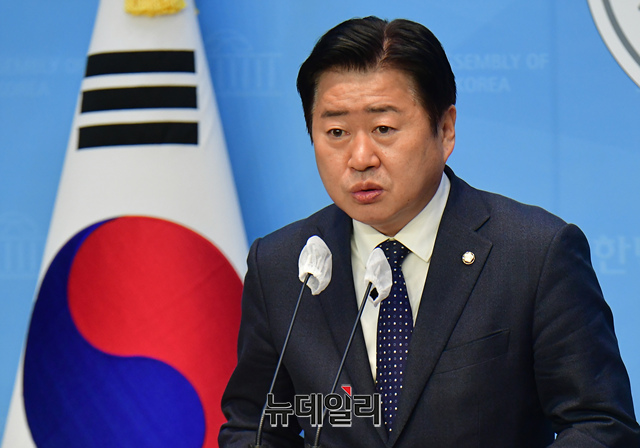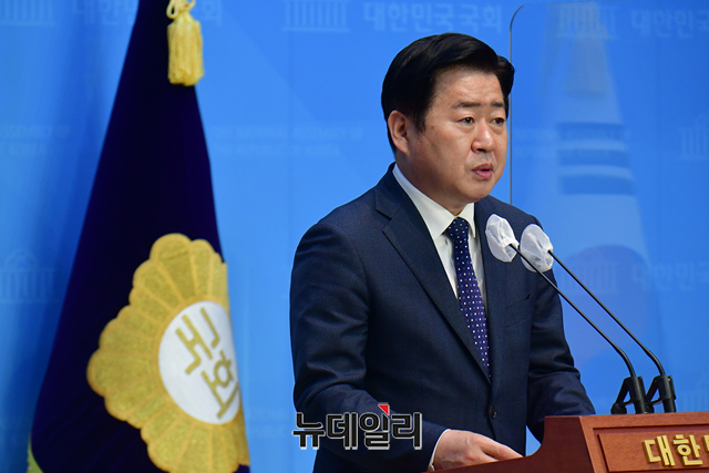 제주도지사 후보로 확정된 오영훈 더불어민주당 의원이 29일 오전 국회 소통관에서 기자회견을 갖고 의원직 사퇴와 선거승리를 다짐하고 있다.