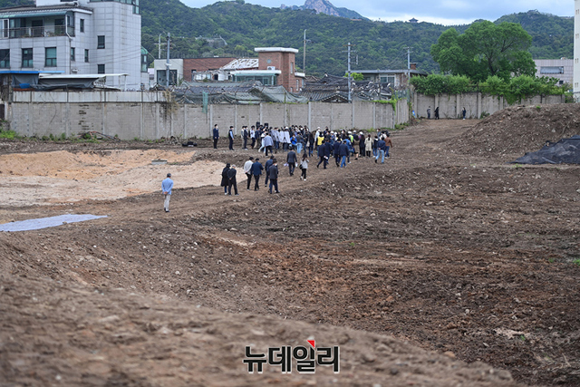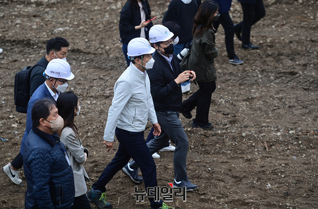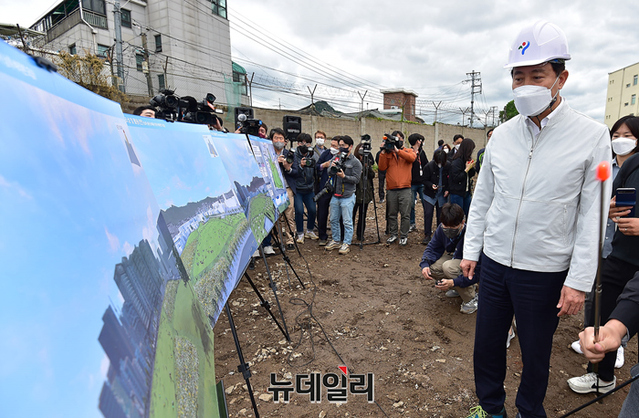 오세훈 서울시장이 29일 오후 서울 종로구 송현동 부지를 방문해 현장 점검을 하고 있다. 서울시는 고 이건희 회장의 기증관이 들어서 예정인 송현동 부지를 '쉼과 문화가 있는 열린공간'으로 조성해 올 하반기 광화문광장 재개장에 맞춰 시민에게 개방할 예정이다.