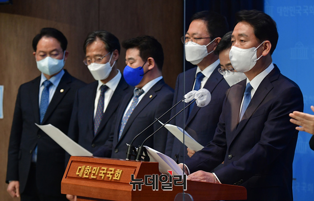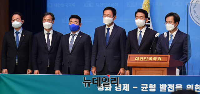 김동연 더불어민주당 경기도지사 후보가 29일 국회 소통관에서 평화경제·균형발전을 위한 평화지역 광역단체장후보 공동선언을 하고 있다. (오른쪽부터 김 후보, 이광재 강원도지사 후보, 박남춘 인천광역시장 후보.)