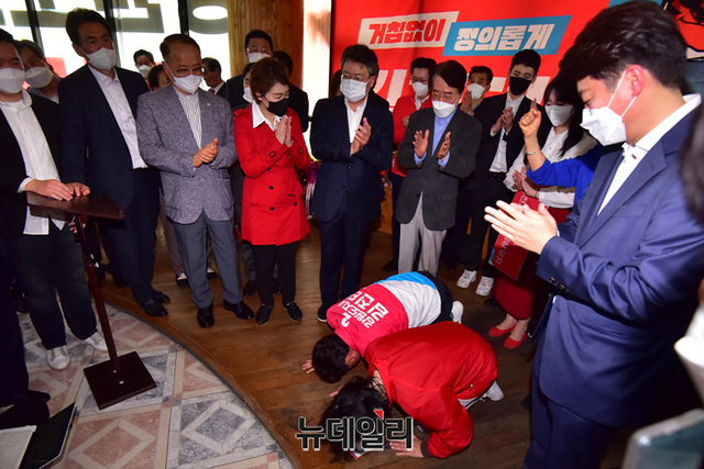 김진태 강원지사 후보와 부인 원현순 여사가 30일 오후 강원 원주시 선거사무소에서 열린 개소식에서 시민들에게 큰절을 하고 있다.