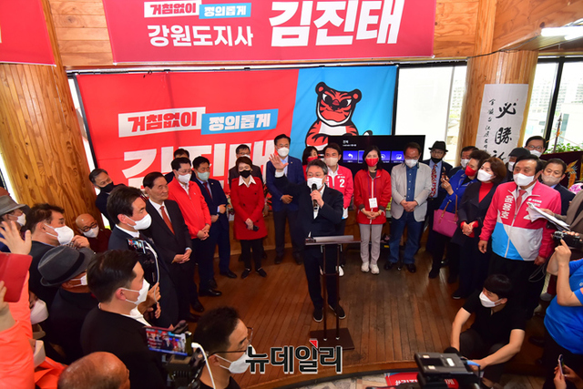 [포토] 김진태 강원지사 후보 응원하는 박정하 당협위원장