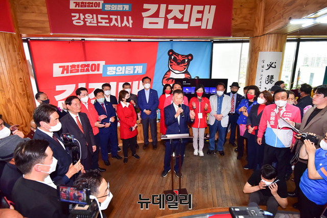 [포토] 김진태 선거사무소 개소식 참석한 김기선 전 의원