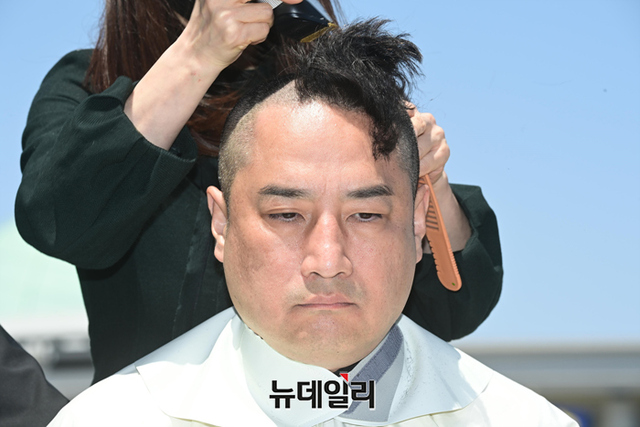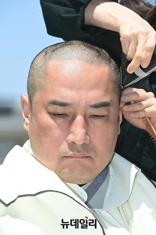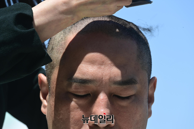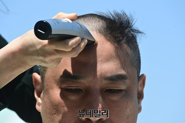 강용석 경기지사 예비후보가 1일 오후 서울 여의도 국회의사당 앞에서 검찰청법 개정안(검수완박)을 본회의에서 처리한 것을 규탄하며 삭발을 하고 있다.