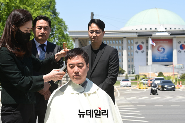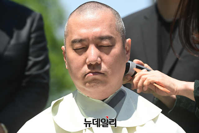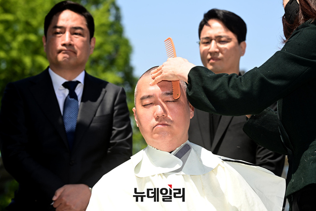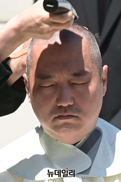 김세의 가로세로연구소 대표가 1일 오후 서울 여의도 국회의사당 앞에서 검찰청법 개정안 본회의 처리를 규탄하며 삭발을 하고 있다.