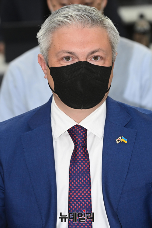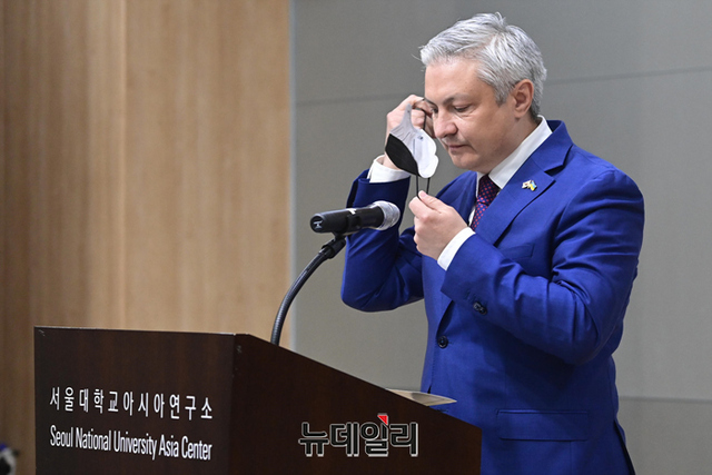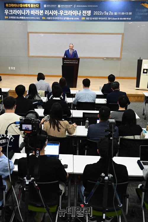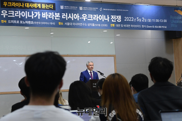 드미트로 포노마렌코 주한우크라이나 대사가 2일 오전 서울 관악구 서울대 아시아연구소 삼익홀에서 '우크라이나가 바라본 러시아-우크라이나 전쟁' 주제로 열린 세미나에서 연설하고 있다.