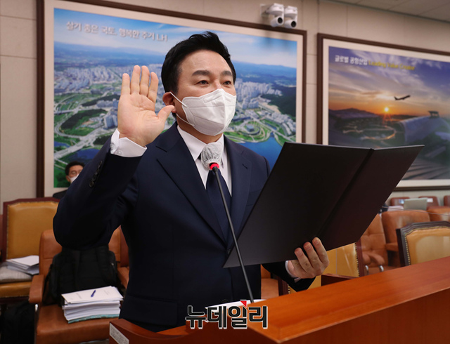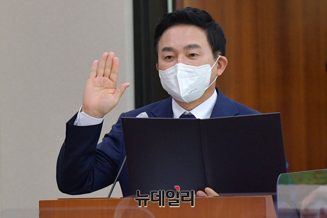 원희룡 국토부장관 후보자가 2일 오전 국회 국토교통위원회 회의실에서 열린 국토부장관 후보자 인사청문회에서 선서하고 있다. (사진=공동취재단)
