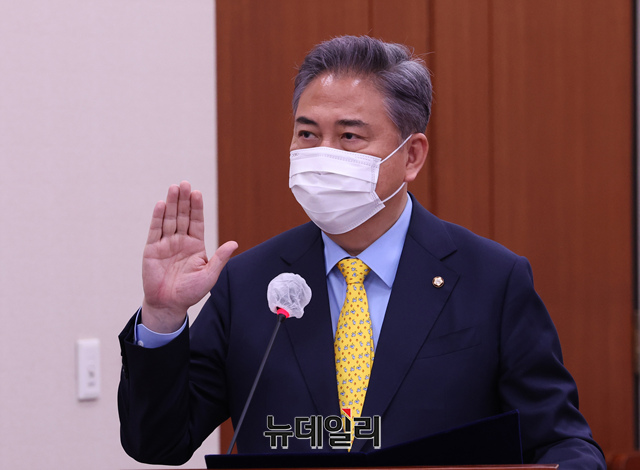 박진 외교부 장관 후보자가 2일 오전 국회에서 열린 인사청문회에서 선서를 하고 있다. (사진=공동취재단)