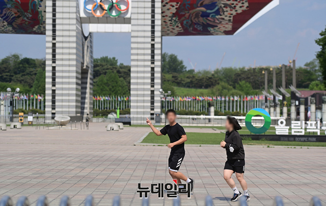 야외에서 마스크 착용 의무가 해제된 첫 날인 2일 오후 서울 송파구 올림픽공원에서 선수들이 마스크 없이 조깅을 하고 있다. 마스크 의무화가 없어진 건 566일 만이다.