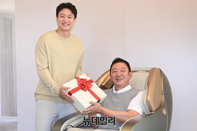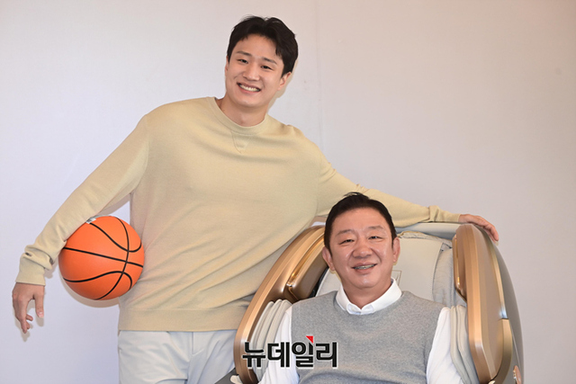 바디프랜드 새 광고모델로 발탁된 허재와 아들 허웅 부자가 3일 오전 서울 종로구 광화문 전시장에서 가정의 달을 기념해 열린 초청 행사에서 포즈를 취하고 있다.