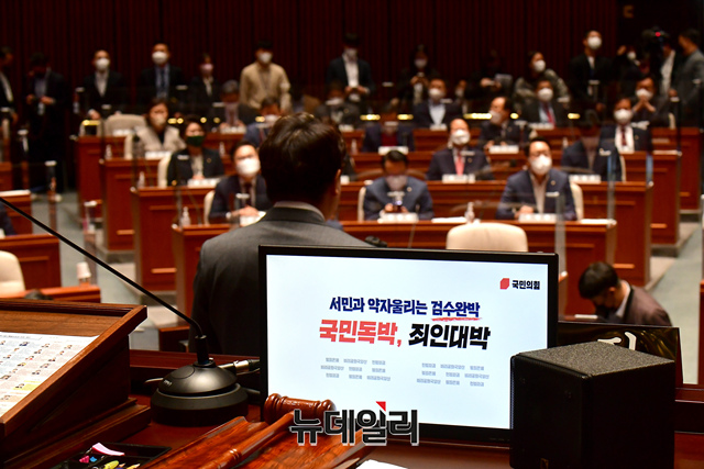권성동 국민의힘 원내대표가 3일 오전 국회에서 열린 의원총회에서 모두발언을 하고 있다.