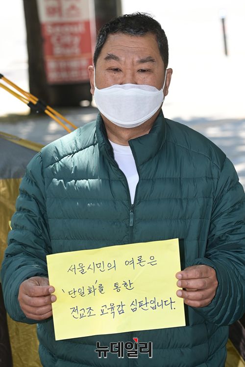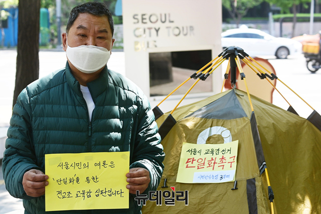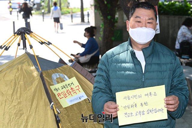 서울교육감 선거에서 중도·보수 후보들의 단일화를 촉구하며 단식농성 중인 박일남 씨가 3일 오전 서울 중구 세종로파출소 인근에 마련된 단식장에서 농성 3일차를 맞고 있다.