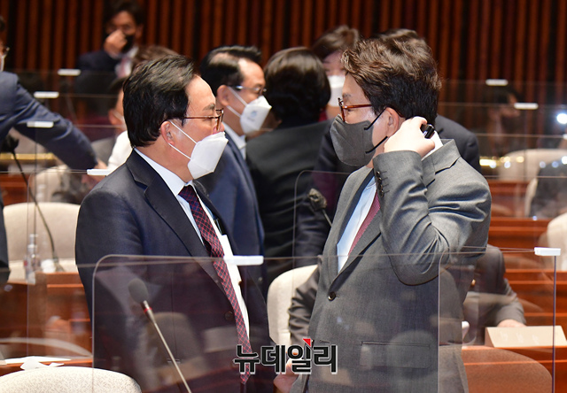 [포토] 의원들과 대화 나누는 권성동 국민의힘 원내대표