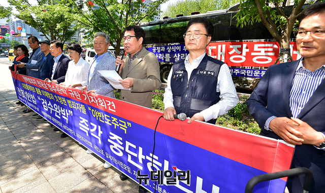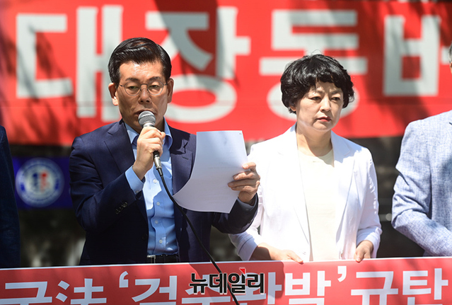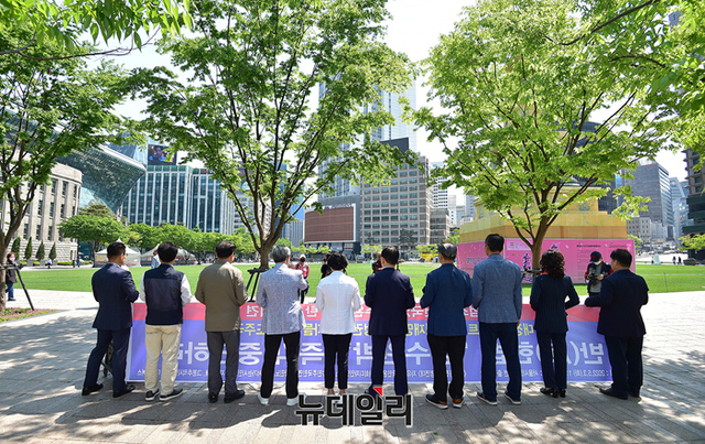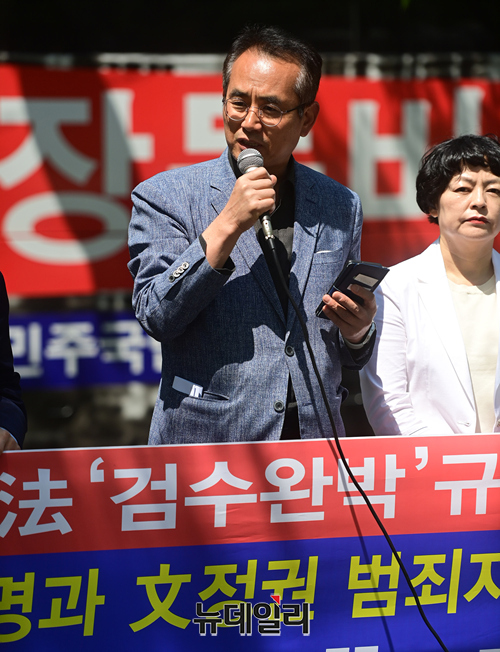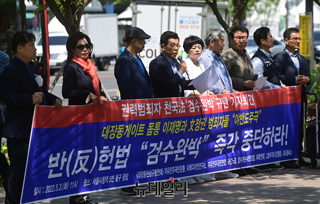 대장동 버스를 기획·운영해 온 시민단체가 3일 오전 서울 중구 서울광장에서 기자회견을 열고 "검수완박은 대장동 게이트 몸통과 文정권 범죄자들의 야반도주극이다"며 문재인 대통령에게 거부권 행사를 할 것을 촉구하고 있다.
