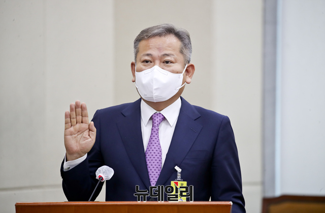 이상민 행정안전부 장관 후보자가 3일 국회에서 열린 행정안전위원회 인사청문회에서 선서를 하고 있다. (사진=공동취재단)