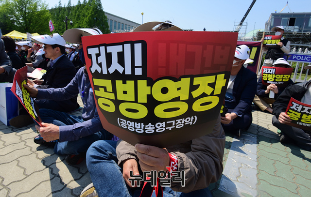 검수완박(검찰 수사권 완전박탈), 공방영장(공영방송영구장악)을 반대하는 시민, 법조, 노동, 사회단체가 3일 오후 국회 정문 앞에서 규탄집회를 갖고 있다.