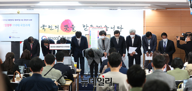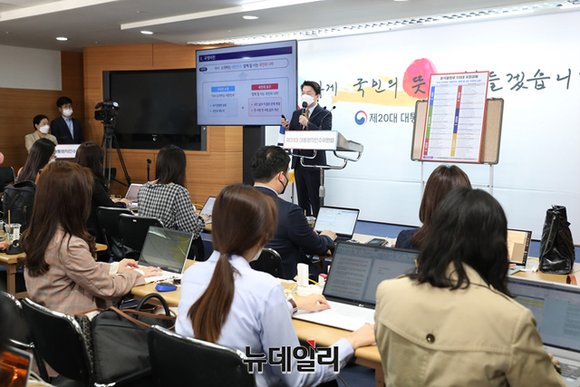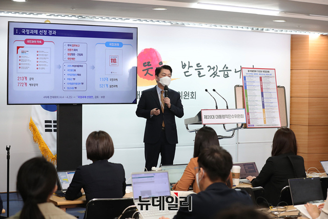 안철수 인수위원장이 3일 오전 서울 종로구 통의동 대통령직인수위원회 공동기자회견장에서 110대 국정과제를 발표하고 있다. (사진=인수위)