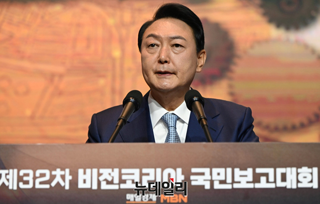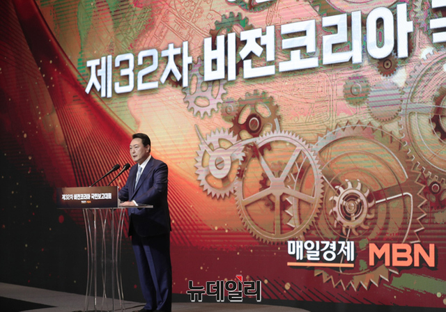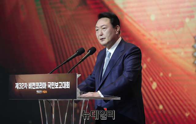 윤석열 대통령 당선인이 3일 오전 서울 용산구 한강로 서울드래곤시티에서 열린 비전코리아국민보고대회에서 축사를 하고 있다. (사진=인수위)