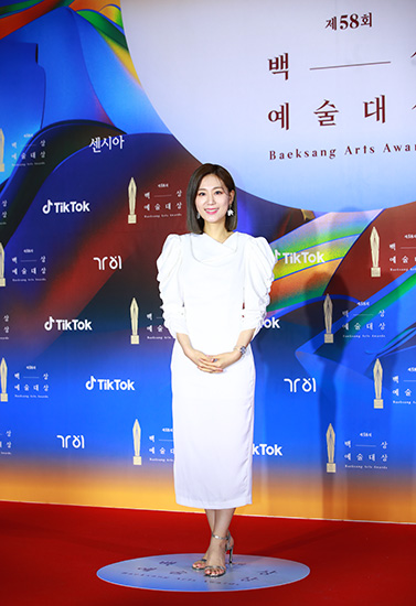 아나운서 송민교가 6일 오후 경기 고양시 일산 킨텍스에서 열린 제58회 백상예술대상 레드카펫에서 포즈를 취하고 있다.