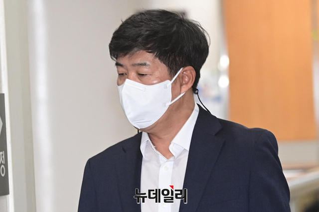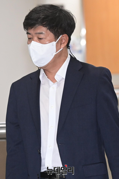 청와대 하명수사 및 선거개입 혐의를 받고 있는 백원우 전 청와대 민정비서관이 9일 오전 서울 서초구 중앙지법에 열린 1심 속행 공판에 출석하고 있다.