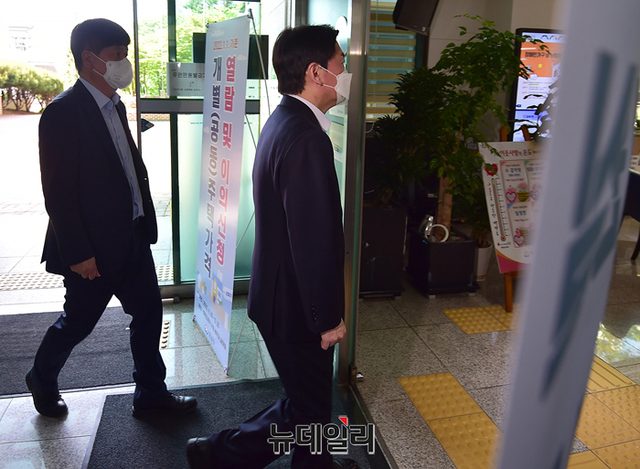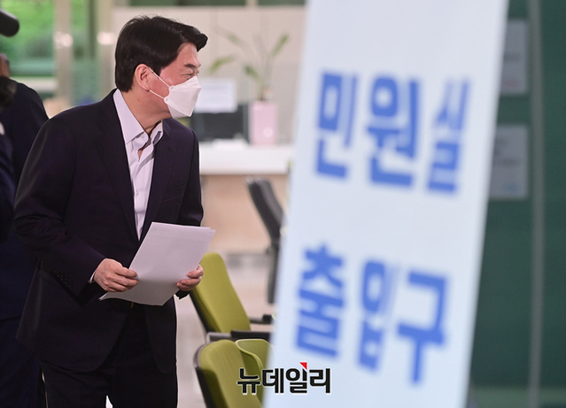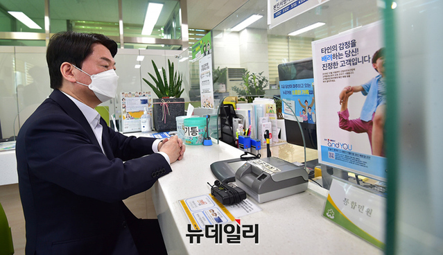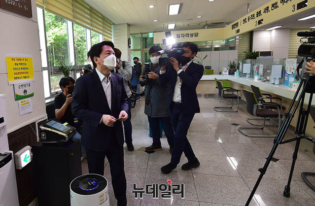 6.1 보궐선거에서 성남시 분당갑 지역에 출마 선언을 한 안철수 예비후보가 9일 오전 경기 성남시 백현동행정복지센터에서 전입신고를 하고 있다.