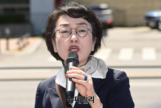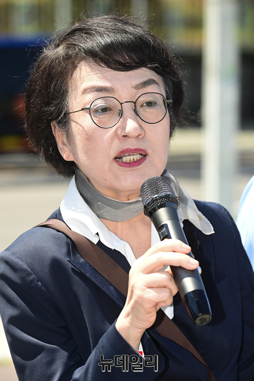 김진애 전 열린민주당 의원이 9일 오전 서울 용산구 전쟁기념관 6·25상징탑 앞에서 열린 윤석열 당선인의 용산 집무실 이전 규탄 기자회견에서 발언을 하고 있다.
