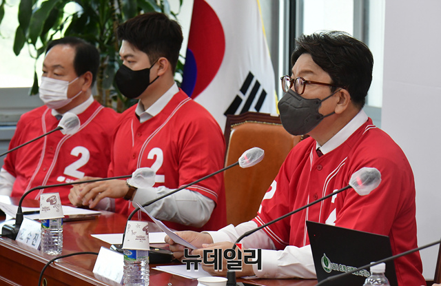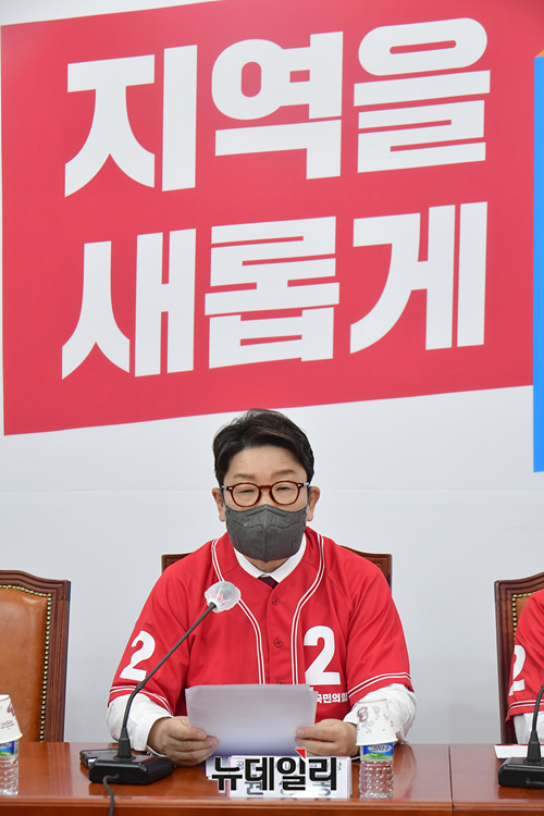 권성동 국민의힘 원내대표가 9일 오전 국회에서 열린 국민의힘 전국동시지방선거 중앙선거대책위원회 제1차 회의에서 모두발언을 하고 있다.