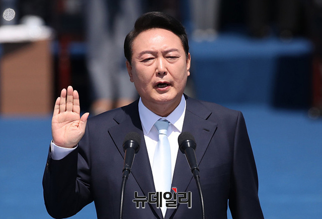 윤석열 대통령이 10일 오전 국회 앞 잔디마당에서 열린 제20대 대통령 취임식에서 선서를 하고 있다. (사진=국방홍보원)