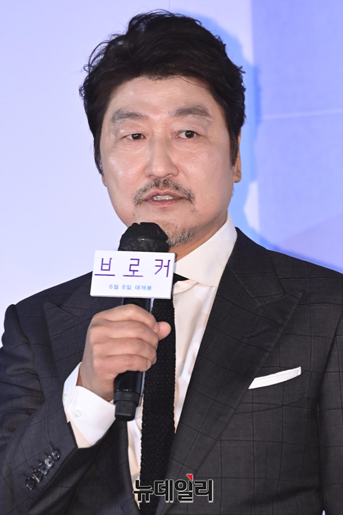 배우 송강호가 10일 오전 서울 용산구 CGV용산아이파크몰에서 열린 영화 '브로커(감독 고레에다 히로카즈)' 제작보고회에서 발언을 하고 있다.
