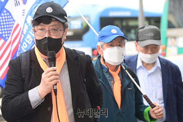 나라지킴이고교연합이 11일 오전 서울 종로구 조영달 서울교육감 예비후보 선거캠프 앞에서 열린 '서울시교육감 후보 중도·보수 단일화 촉구' 기자회견에서 구호를 외치고 있다.