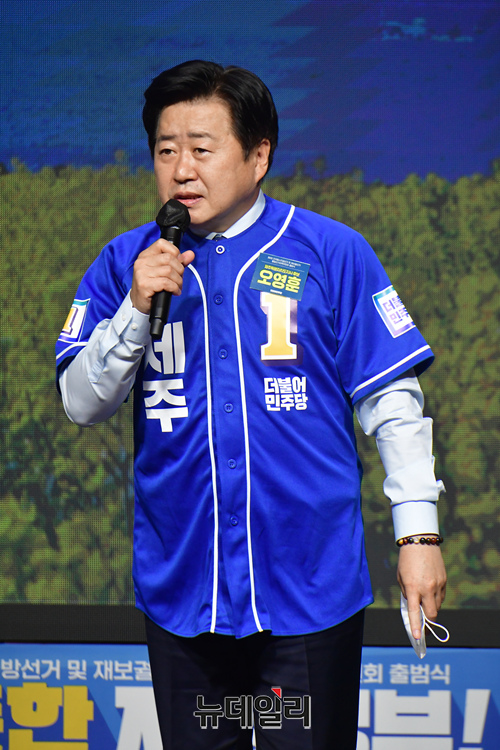 오영훈 제주도지사 후보가 11일 국회에서 열린 더불어민주당 전국동시지방선거 및 재보궐선거 통합선거대책위원회 출범식 및 공천장 수여식에 참석해 발언을 하고 있다.