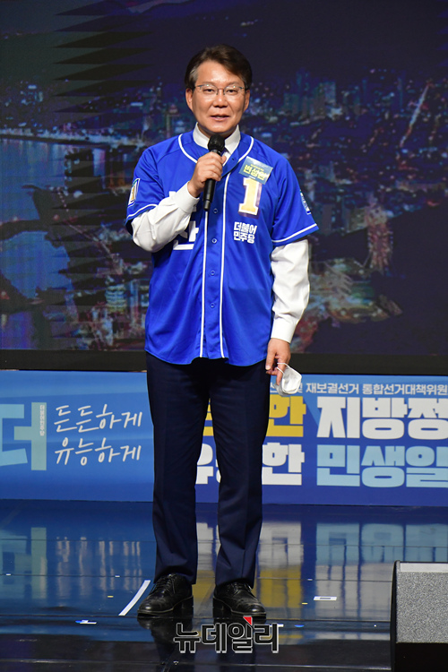 변성완 부산광역시장 11일 국회에서 열린 더불어민주당 전국동시지방선거 및 재보궐선거 통합선거대책위원회 출범식 및 공천장 수여식에 참석해 발언을 하고 있다.