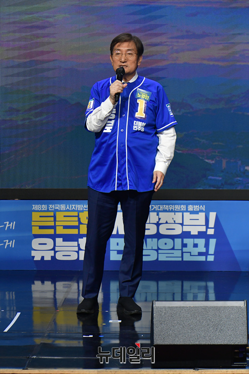 노영민 충북도지사 후보가 11일 국회에서 열린 더불어민주당 전국동시지방선거 및 재보궐선거 통합선거대책위원회 출범식 및 공천장 수여식에 참석해 발언을 하고 있다.