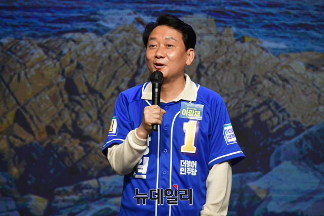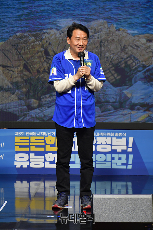 이광재 강원지사 후보가 11일 국회에서 열린 더불어민주당 전국동시지방선거 및 재보궐선거 통합선거대책위원회 출범식 및 공천장 수여식에 참석해 발언을 하고 있다.