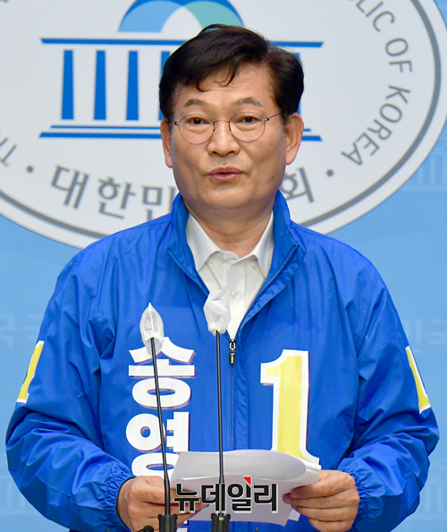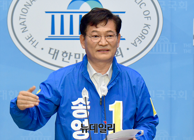 송영길 더불어민주당 서울시장 후보가 11일 오후 국회 소통관에서 부동산 정책공약 발표 기자회견을 갖고 있다.