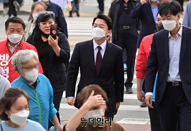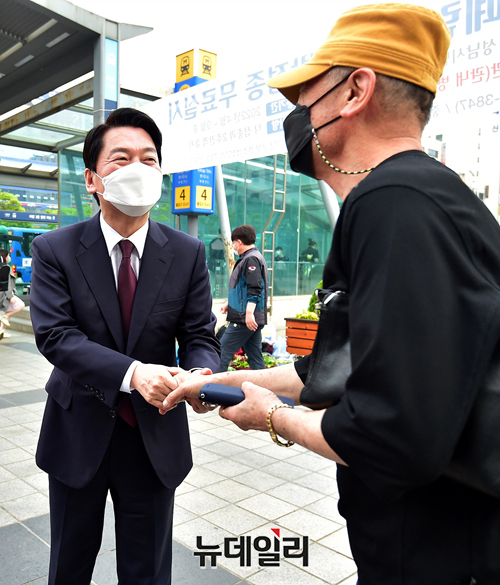 성남 분당갑 지역 국회의원 보궐선거에 출마한 안철수 예비후보가 11일 오후 경기 성남시 야탑역에서 시민들에게 퇴근길 인사를 하고 있다. 안 예비후보는 12일 후보자 등록을 마무리 할 예정이다. (경기 성남=정상윤 기자)