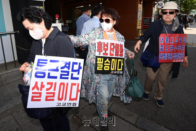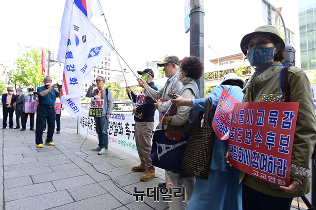 나라지킴이고교연합이 12일 오전 서울 종로구 조영달 서울교육감 예비후보 선거캠프 앞에서 열린 '서울시교육감 후보 중도·보수 단일화 촉구' 기자회견에서 구호를 외치고 있다.