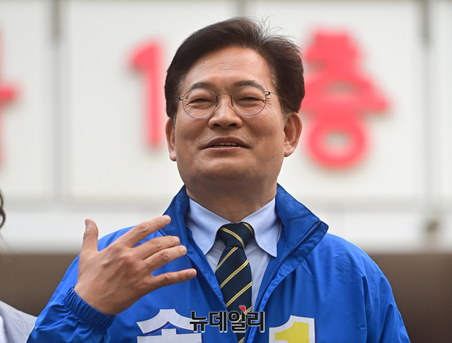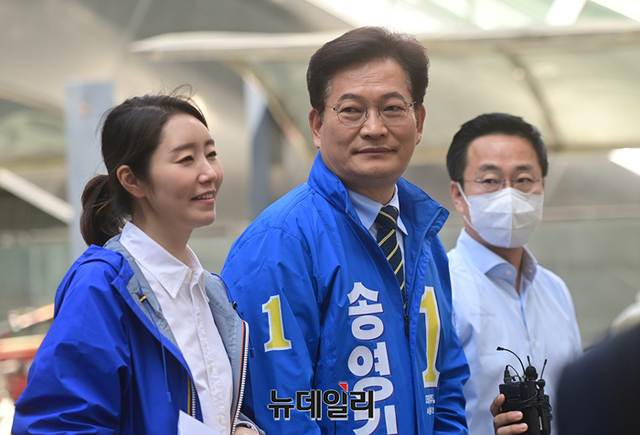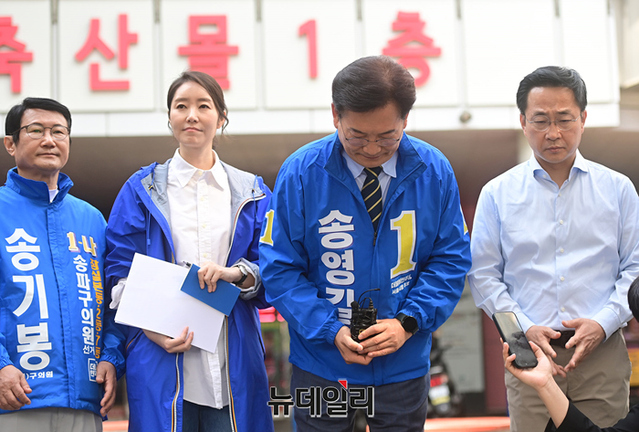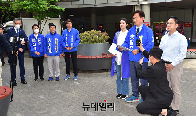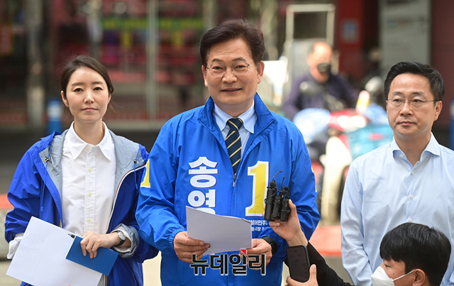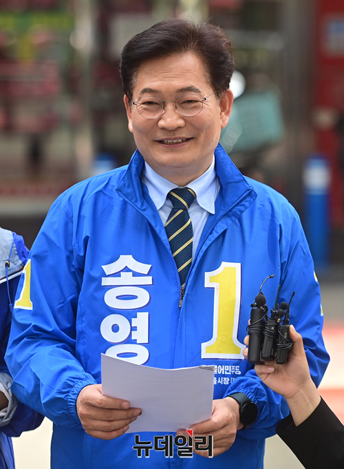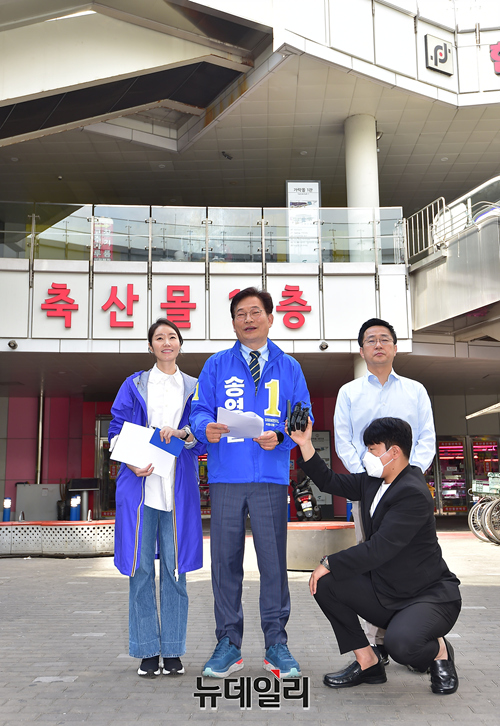 송영길 더불어민주당 서울시장 후보가 13일 오전 서울 송파구 가락몰 광장에서 민생공약 '민트1호'를 발표하고 있다. 송 후보는 이날 오후 KBS 주최 서울시장 후보 토론회에 참석할 예정이다.