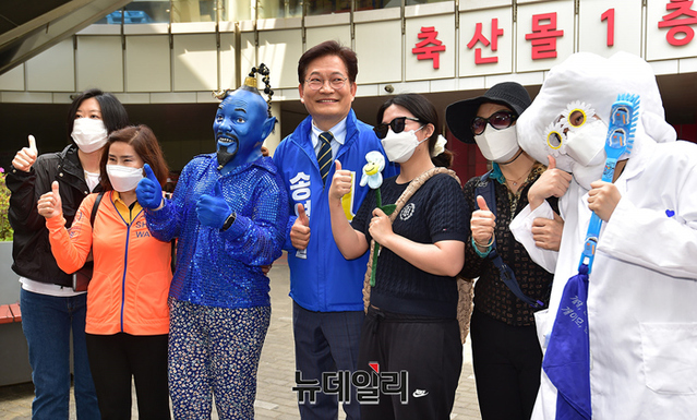 송영길 더불어민주당 서울시장 후보가 13일 오전 서울 송파구 가락몰 광장에서 민생공약을 발표하는 기자회견에서 지지자들과 기념촬영을 하고 있다. 송 후보는 이날 오후 KBS 주최 서울시장 후보 토론회에 참석할 예정이다.