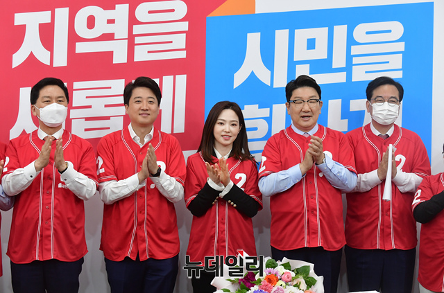 당구선수 차유람이 13일 오전 국회에서 열린 국민의힘 입당 환영식에서 이준석 당대표, 권성동 원내대표 등과 기념사진을 촬영하고 있다.