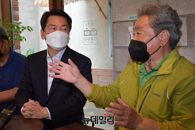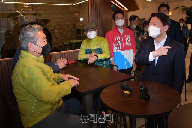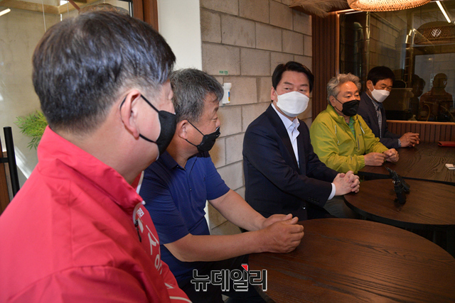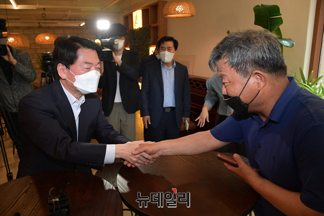 안철수 국민의힘 성남 분당갑 국회의원 예비후보가 13일 오전 경기 성남시 자유의지 카페에서 열린 대장동 원주민 간담회에서 김동훈 전 대장동보상대책위원장과 악수를 하고 있다.