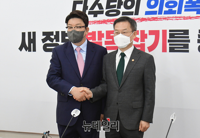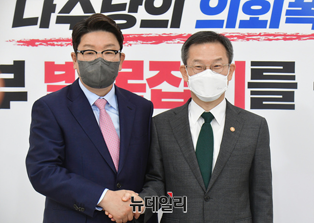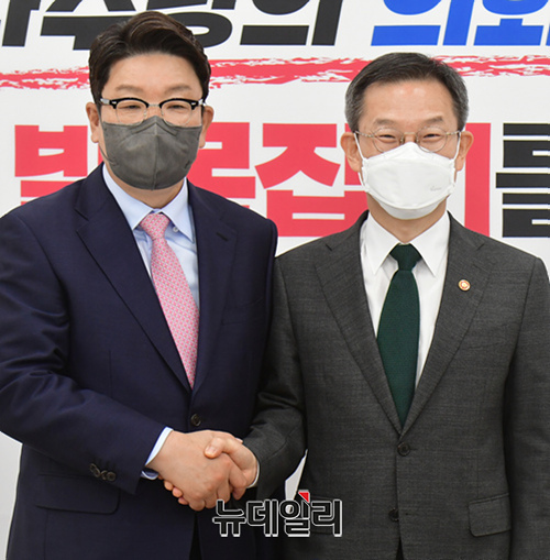 권성동 국민의힘 원내대표가 13일 국회에서 이종호 과학기술정보통신부 장관을 접견해 악수하고 있다.