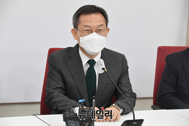 권성동 국민의힘 원내대표가 13일 오전 국회에서 이종호 과학기술정보통신부 장관을 접견하고 환담을 나누고 있다.