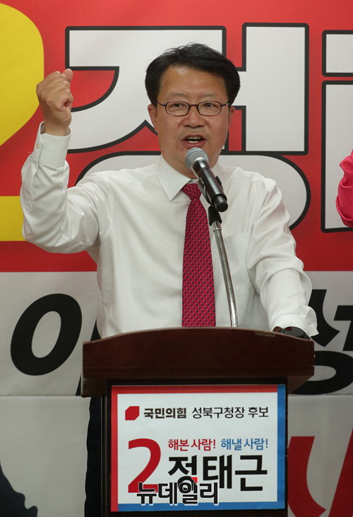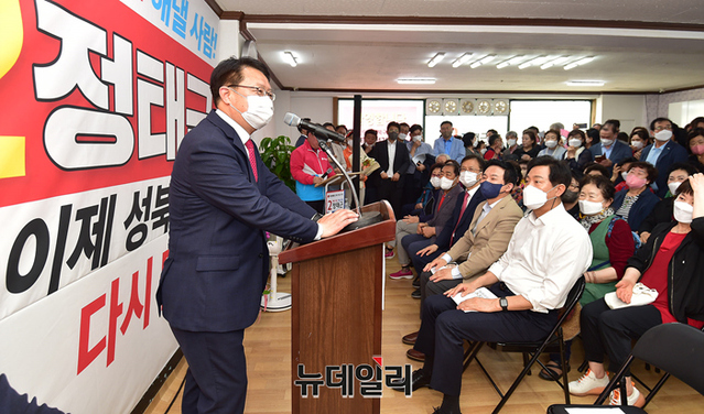 정태근 국민의힘 성북구청장 후보가 13일 오후 서울 성북구 선거사무소 개소식을 갖고 인사말을 하고 있다.