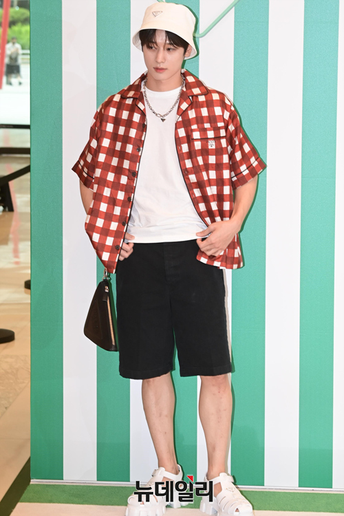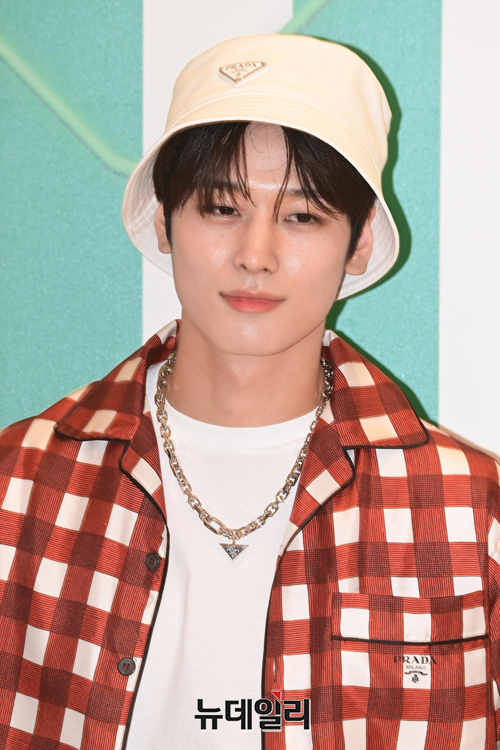 더보이즈 멤버 주연이 13일 오후 서울 여의도 더 현대 서울에서 열린 프라다 트로피코 익스클루시브 팝업스토어 오픈 기념 행사에서 포즈를 취하고 있다.