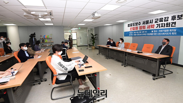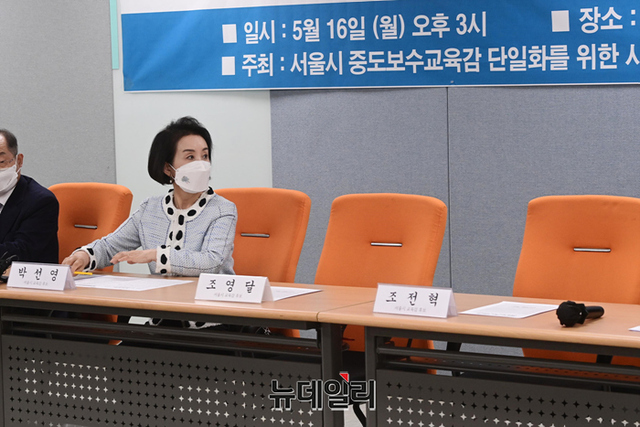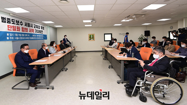 [포토] 범중도보수 교육감후보 단일화 합의 서약 기자회견 참석한 박선영